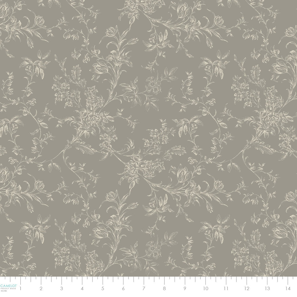 Rosalind Grey by artist Andrea Jasid Grassi is a dreamy, romantic quilting cotton fabric collection blooming with delicate camellias, soft florals, and timeless feminine charm. In soft shades of cream, grey, blush and dusty coral, each print evokes classic elegance, perfect for bridal accents, wedding decor, heirloom quilts and projects needing elevated, sophisticated designs.