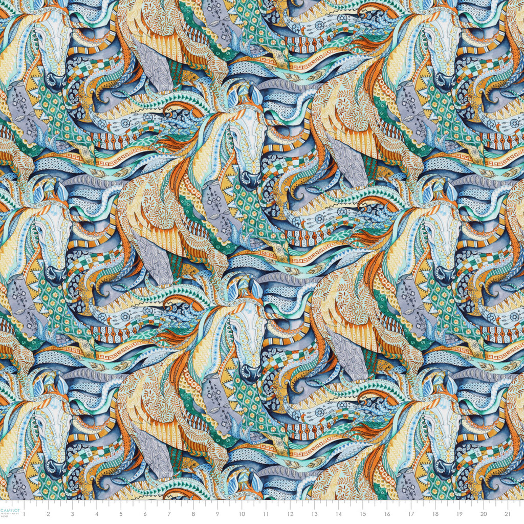 Embark on a bohemian journey with Rhapsody, a quilting cotton fabric collection that echoes the Spirit of the Plains. Full of lush, intricate details—horses, leaves, chains, vines, feathers, and boho geo patterns, the collection evokes generations of storytelling inspired by the rich traditions of tribal heritage. Ideal for heirloom quilts, stunning apparel and cozy home decor.