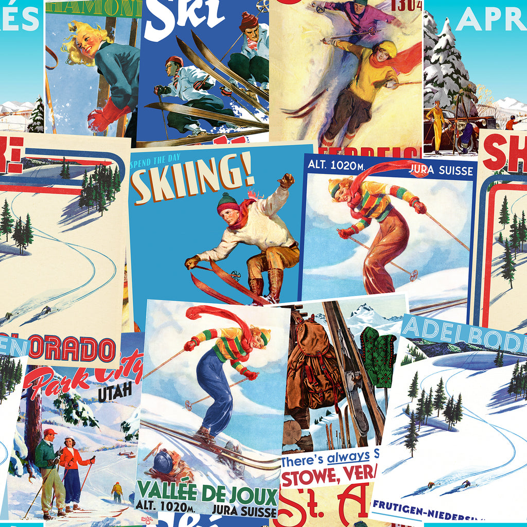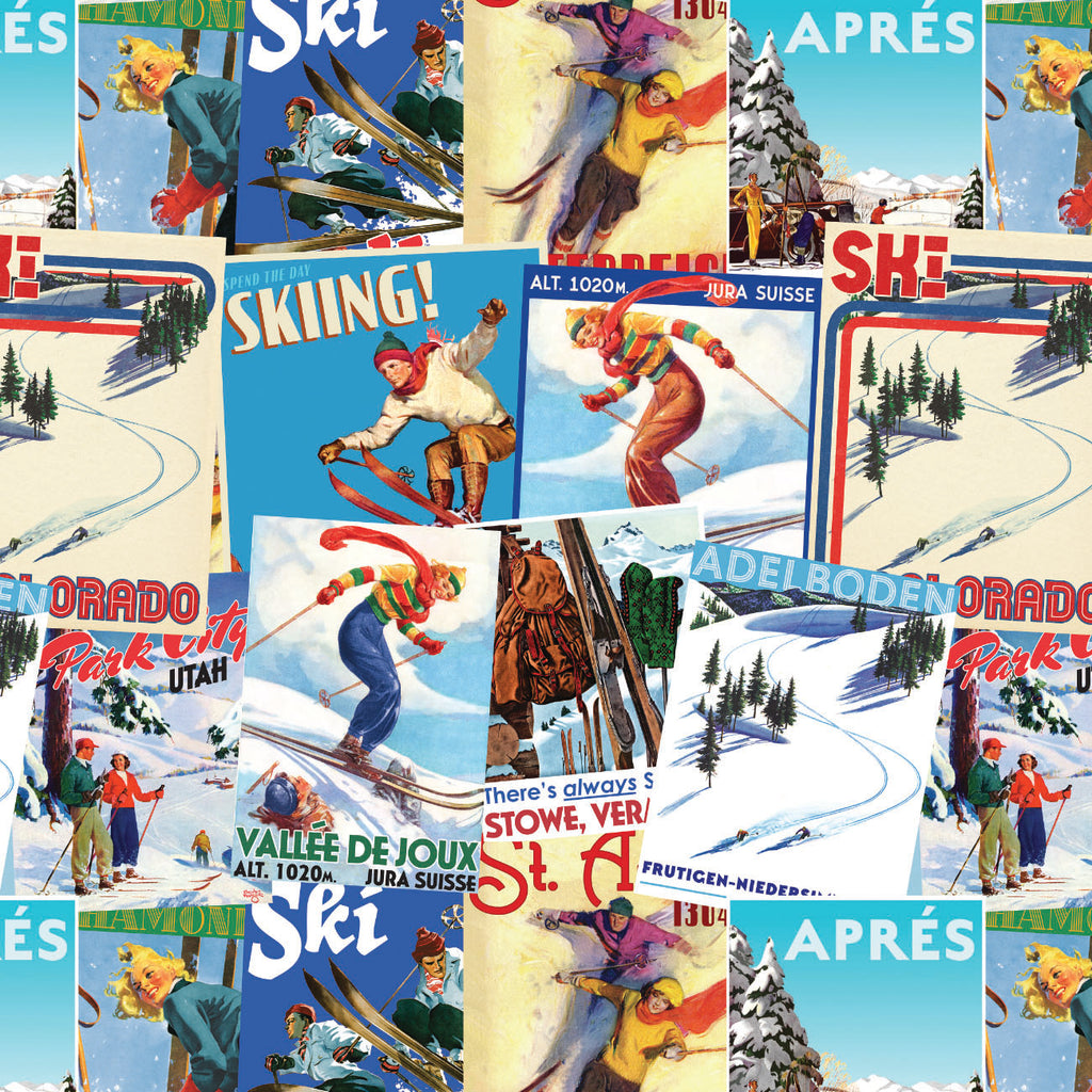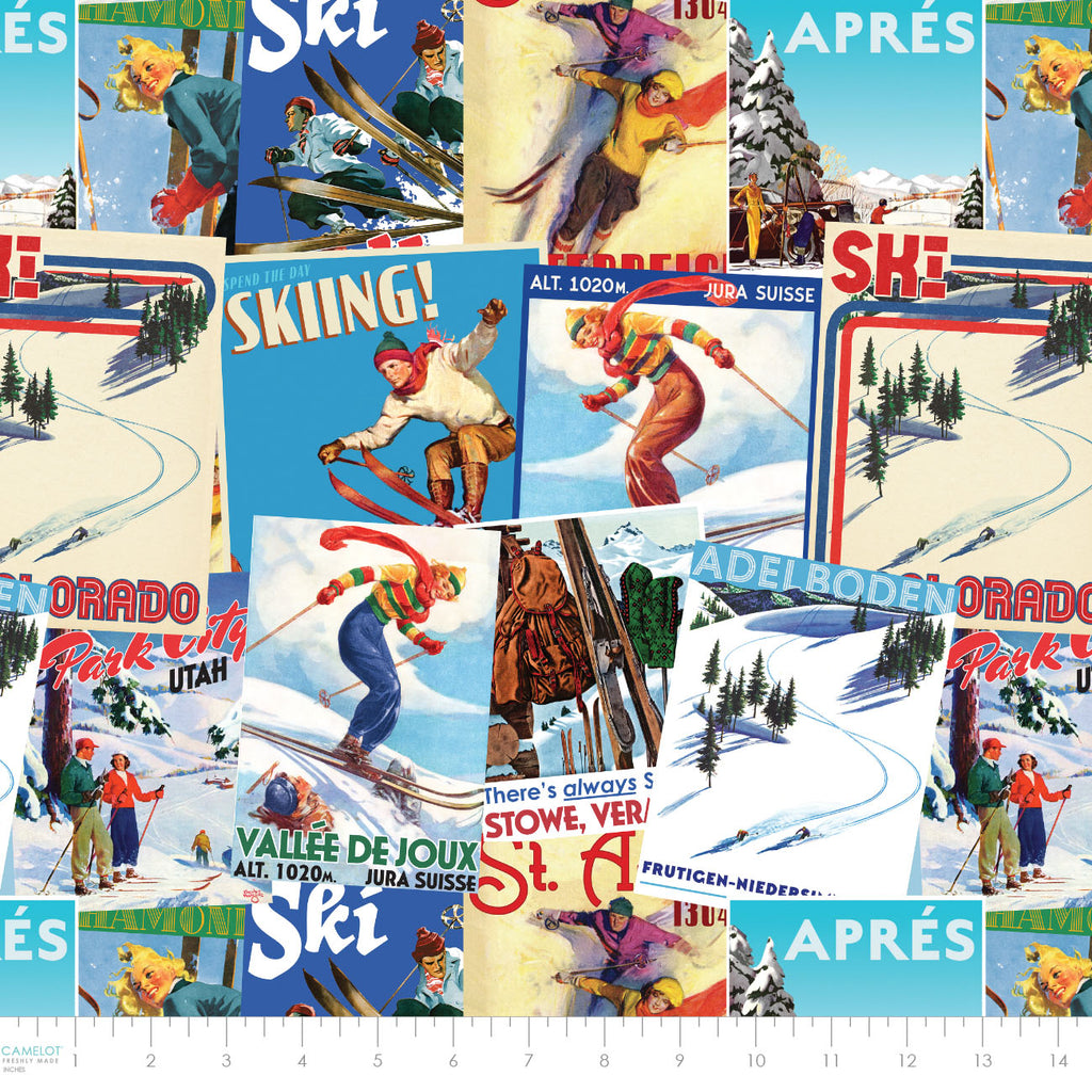 Hit the slopes in style with Après Ski, an officially licensed quilting cotton fabric collection from The Saturday Evening Post, inspired by the vintage ski posters and snowy alpine resort prints showcased in the line. Featuring retro skis, cozy hot beverages and classic Swiss Cross motifs in bright-but-subdued vintage hues, this collection brings the charm and warmth of winter fun to every quilt and project. Play up on the theme with throw pillows shaped like mountains and quilts with winter elements. Pair with comfy fabrics like fleece for even more comfort.